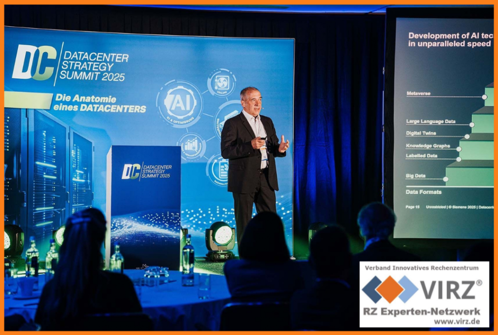 Zukunftsaussichten für KI-gestützte Rechenzentren mit HPC, Quantencomputern und Photonencomputern in IT und OT wurden von Hartwig Bazzanella (VIRZ-Vorstandsmitglied) im Rahmen einer Keynote repräsentiert. Mit der Fragestellung: ‘Wie smart wird das Datacenter von morgen?‘ informierte in einem Strategy Inside Steffen Breiter (VIRZ-Vorstandsmitglied) u.a. zum Reifegrad der KI, den anwenderorientierten Innovationen und dem dynamisch vernetzten Ergebnis von KI im Rechenzentrum. Wir freuen uns schon heute auf das Format von 2026, dann in Heidelberg.
